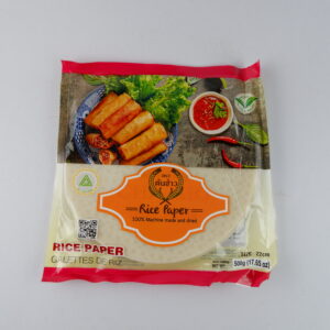 แผ่นปอเปี๊ยะ ตราต้นข้าว แผ่นแป้งสลัดโรล หรือ ใบเมี่ยงห่อสลัด ตราต้นข้าว เส้นผ่าศูนย์กลาง 22 เซนต์ ถุงละ 500 กรัม
